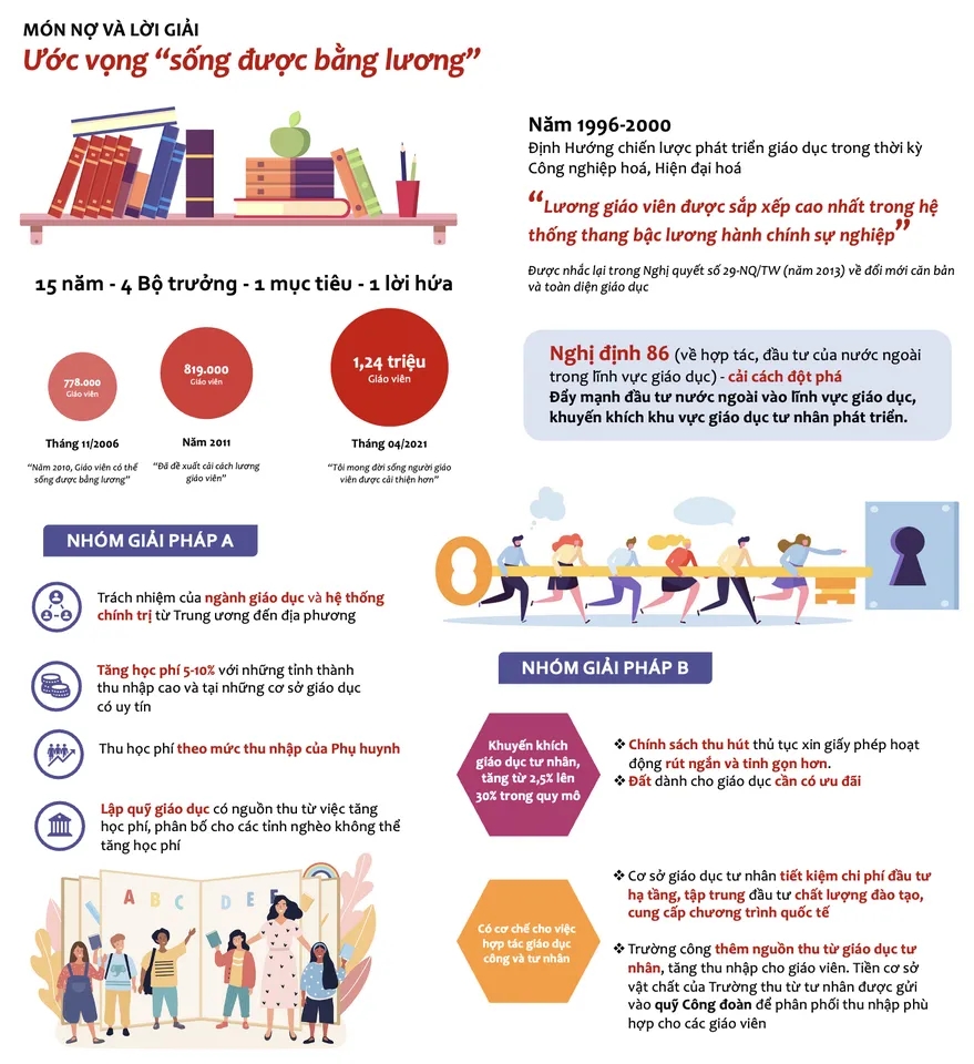 Khi trở thành tân Bộ trưởng Bộ Giáo dục và Đào tạo, ông Phạm Vũ Luận cũng nói: “Đã đề xuất cải cách lương giáo viên”. 05 năm sau, Bộ trưởng Phùng Xuân Nhạ chia sẻ: “Lương giáo viên là món nợ mà tôi day dứt”. Và tháng 4 rồi, trong những phát biểu đầu tiên sau khi nhậm chức, tân Bộ trưởng Bộ Bộ Giáo dục Nguyễn Kim Sơn tiếp tục bày tỏ: “Tôi mong đời sống người giáo viên được cải thiện hơn”. 15 năm, 4 đời Bộ trưởng, có thể thấy một điểm chung trong mục tiêu của họ: Tăng thu nhập cho giáo viên. Nhưng giờ thì ông Nguyễn Thiện Nhân đã về hưu, nhiệm kỳ của Bộ trưởng Nguyễn Kim Sơn đã đi qua được 07 tháng, ước vọng “sống được bằng lương” của các thầy cô giáo vẫn chưa thể thực hiện.